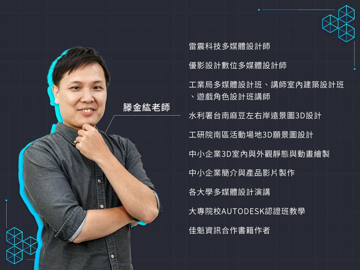 滕金紘老師從事動畫及產品設計專業已長達約13年的時間,致力於視訊、動畫與室內建築設計的領域,近年來不斷往互動式媒體發展,最主要專長在於插畫/漫畫、3D電腦動畫、影像合成、影片後製作、多媒體動畫、線上動畫、線上遊戲、光碟遊戲等範疇。在業界擔任多媒體設計師,協助中小企業完成產品動畫與簡介,也製作過3D遊戲動畫與3D展場動畫,業界經驗豐富;並曾協助多達50位以上的學員進入遊戲動畫職場,如智冠智樂堂與西基動畫公司以及多達50位以上學員進入室內建築行業等。